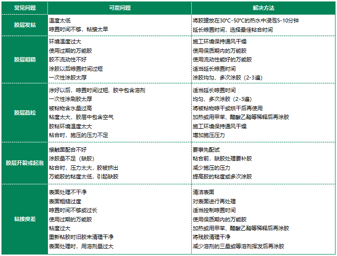 根據不同粘接需求采用刷涂法、刀刮法、滾涂法、絲網印膠法等,將膠水均勻得涂敷在被貼合物表面,待膠膜指觸干爽(即手指離開膠面時無膠絲帶起)即可粘結,通常粘結時間為15分鐘,最佳粘結時間為20~30分鐘(視施工溫度濕度而定),粘結后適當加壓效果更佳!